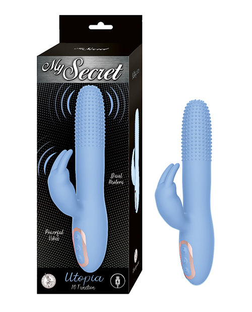 Experience a new level of pleasure with the Nasstoys My Secret Utopia, a powerful and versatile toy designed to deliver intense stimulation. With 10 vibrating functions and dual motors, this USB rechargeable massager offers a range of sensations to suit your mood. The insertable end features a textured shaft, providing extra stimulation for a deeper, more fulfilling experience, while the external stimulator is equipped with fluttery bunny ears, perfect for teasing and pleasing sensitive areas. Whether youre exploring solo or with a partner, My Secret Utopia is designed for endless possibilities, delivering quiet yet powerful vibrations that will leave you craving more. Crafted from body-safe silicone, this massager is both comfortable and easy to clean. Its splash-proof design makes for hassle-free maintenance. For optimal performance, be sure to fully charge the toy before its first use to prime the battery. Compatible with water-based lube, My Secret Utopia enhances sensation and ensures maximum comfort. After use, clean with toy cleaner or mild antibacterial hand soap to keep it in top shape.