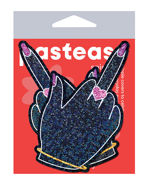 Middle Finger Pasties: Glittering F*ck You Lady Hands Nipple Covers by Pastease Hand-made in the USA of soft form-fitting material that forms seamlessly to curves and resists wrinkling over hardening nipples. Just peel-and-stick on clean, dry skin. All Pastease feature latex-free, medical-grade, waterproof adhesive that stay securely in place for as long as you like and until they are gently removed. Conceal or Reveal with Pastease nipple pasties when worn with a sexy outfit, daring bikini, sheer top, revealing dress, Hefty bag, body lotion, crazy costume, party theme or nothing at all! Dimensions: 2.8 x 4.7 inches Coverage Diameter: 2 inches.