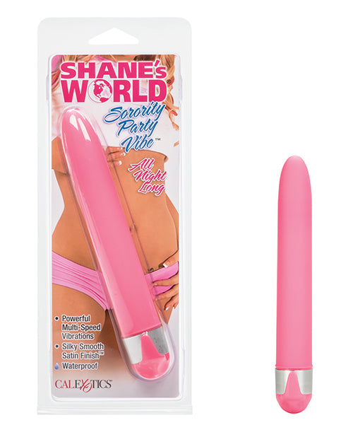 Party all night long until you just cant orgasm anymore with the Shanes World Sorority Party Vibe-All Night Long. If youre looking for the vibe that will go deeper, harder, and longer and matches your boundless craving for pleasure, this sex toy is for you. It measures in at 6.5 inches long and 1 inch wide, so itll be sure to hit all the right spots when you slip it inside of you. The vibrant toy is perfect for any stimulation: Use it on your clit, your lips, or slip it inside you to see if you can take all of its long 6.5 inches. This adult toy is specially designed to provide powerful, multi-speed vibrations. Its easy to use: Just twist off the battery cap, slide in two AA batteries, and replace the battery cap. Then turn the base until you find your favorite speed and intensity of the many available, lay back, and let the orgasms roll in. The sex toy is perfect for beginner exploration or seasoned vibe users. Its long enough to hit every imaginable spot and help you explore every inch of yourself. The Shanes World Sorority Party Vibe-All Night Long is covered in a silky-smooth, velvety coating that will drive you positively wild. Its even 100 percent waterproof for seriously sexy fun in and out of the water. Go all night long or give yourself a quickie with this wonderfully smooth and seamless vibrator.