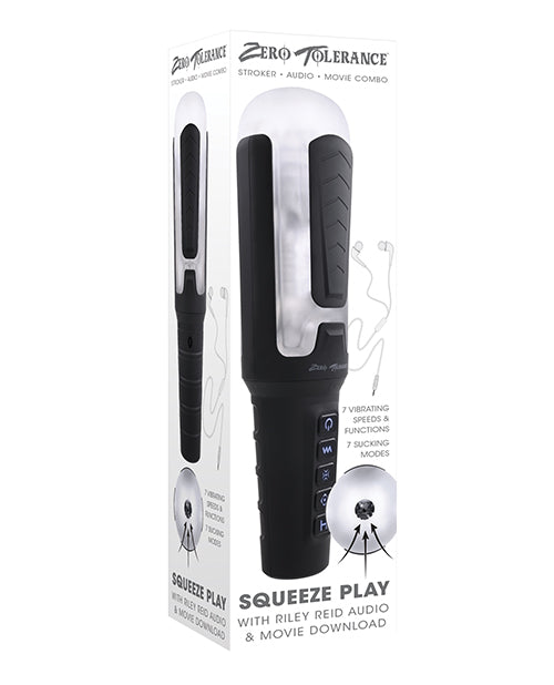 Put the squeeze on your play time with the powerful stroker that not only sucks and vibrates but also lets you squeeze whenever you want with ergonomic squeeze grips! The seven-speed suction and vibration feel so good, especially with the super-soft and stretchy sleeve thats made from powdered TPE to slip and slide with ease. Let your fantasies run wild as this toy comes with an erotic Riley Reid audio for inspiration - with earbuds so you can hear her up close and personal! Youll also get a free movie download for a sensational visual experience! The case comes apart for easy cleaning, including an evacuation tube to make sure its ready for your next squeeze play! Five Year Warranty.